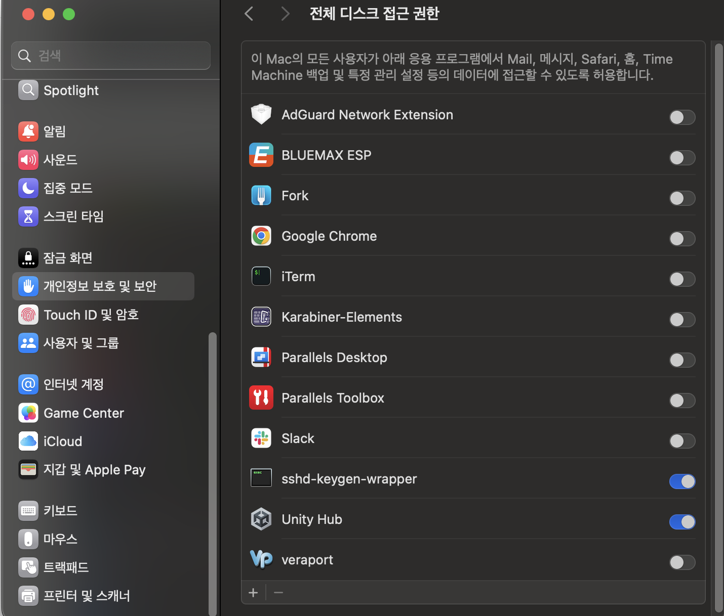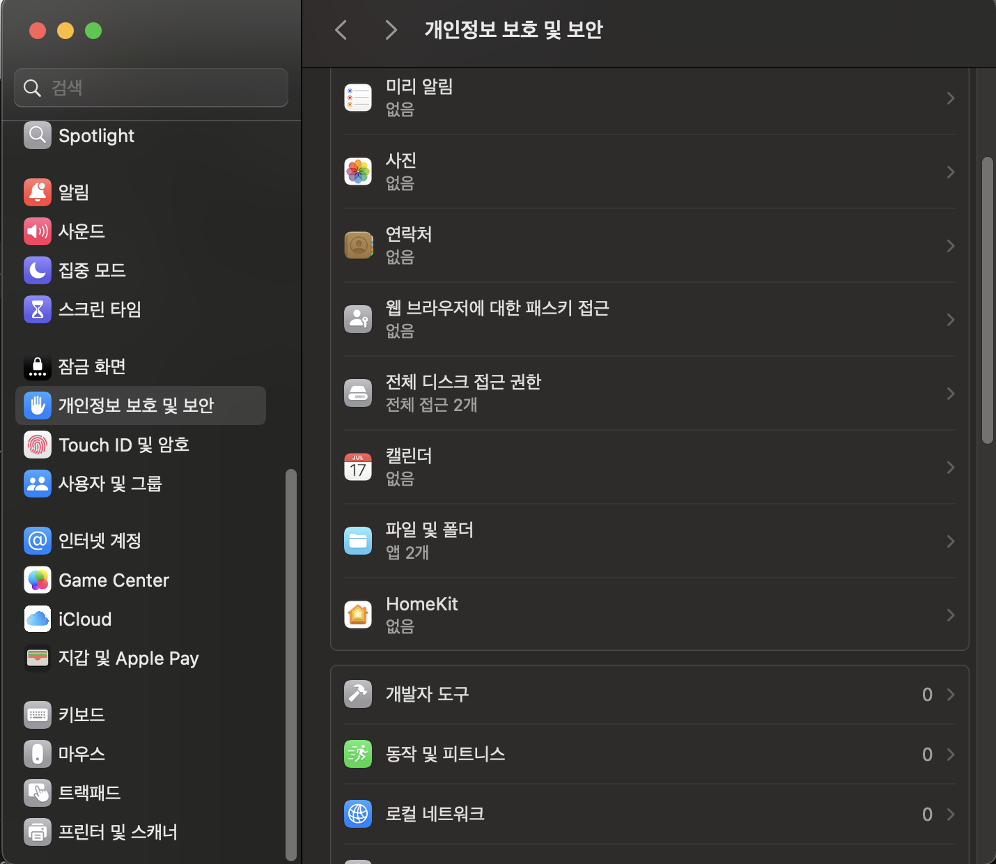 시스템 설정 -> 개인정보 보호 및 보안 -> 전체 디스크 접근 권한