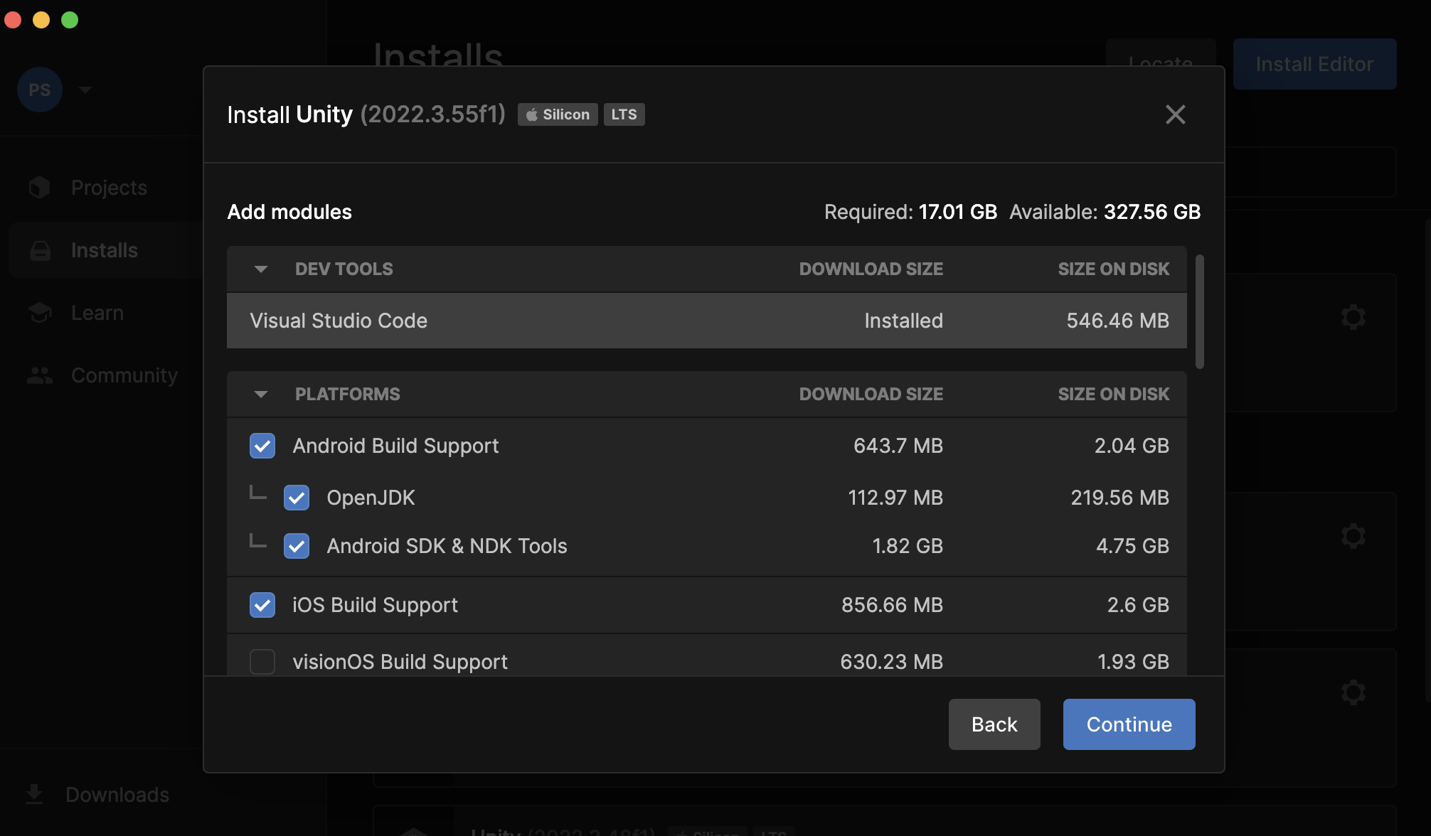 아래쪽 이미지 처럼 안드로이부분 모두 체크 (Android Build Support 와 하위 부분 모두 체크)