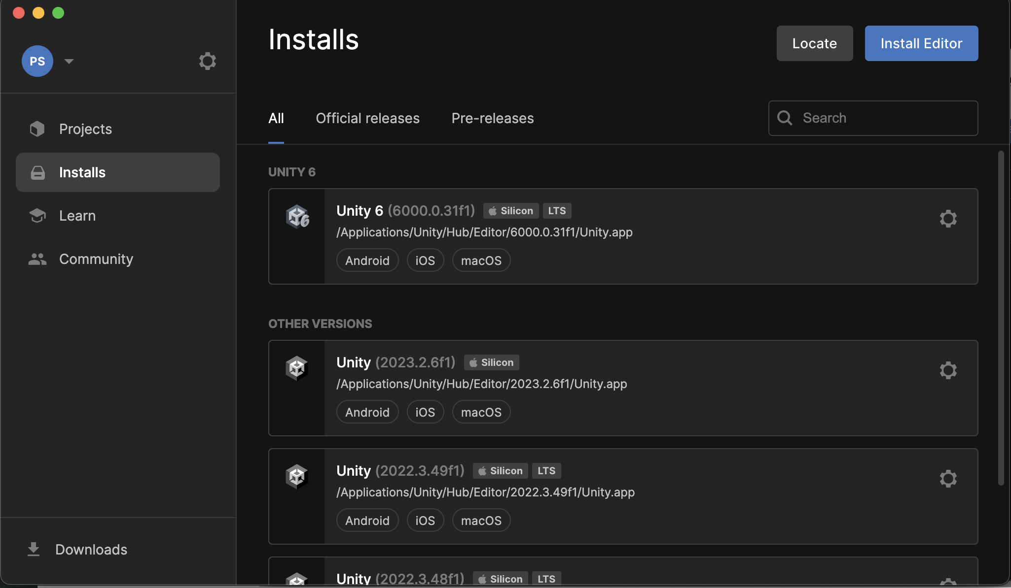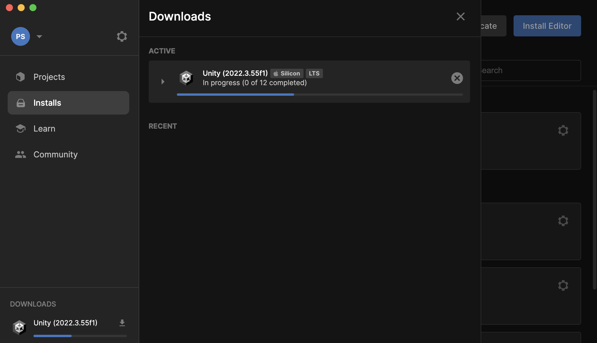 왼쪽 Installs 탭 클릭 -> 오른쪽 상단 Install Editor 클릭