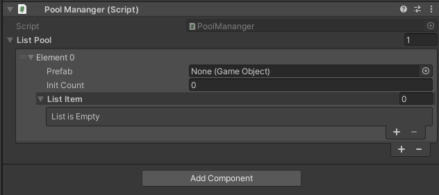 +를 누르면 Prefab, InitCount가 있는 요소가 추가됩니다. Prefab에는 풀링할 오브젝트를 넣어줍니다.