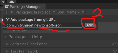 4.URL 주소에 com.unity.nuget.newtonsoft-json 넣어서 Add를 눌러주세요.