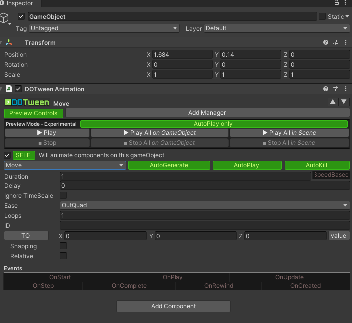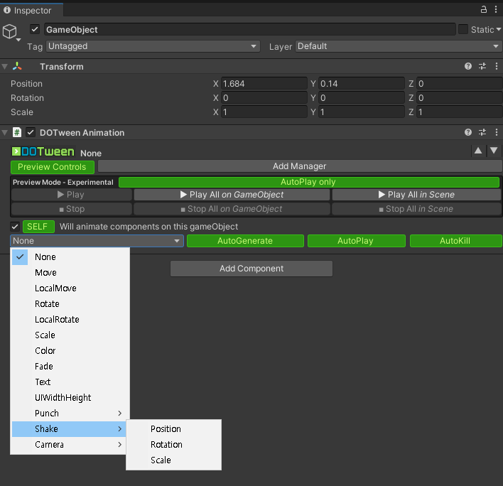 오브젝트에 DOTween Animation을 붙이면 이동, 회전, 색상변경(이미지나, 텍스트 등), 스케일 변경, 카메라 쉐이크 등 기본적으로 많이 사용하는 에니메이션을 시간 및 반복, 딜레이, 에니메이션 커브를 사용하여 다양하게 작동시킬수 있습니다.
