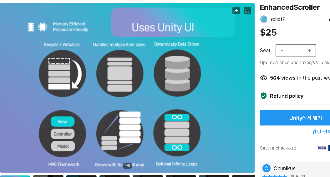 점차 에셋 스토어가 활발해지면서 무한스크롤을 구입하거나 무료소스를 구하여 자기회사에 맞게 쓰는 경우가 많아지고 있습니다. 그래서 저의 회사에서 사용하고 있는 에셋 스토어에 있는 유료 에셋 무한스크롤을