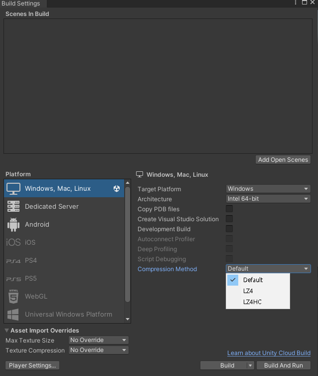 Unity는 Default, LZ4 및 LZ4HC의 세 가지 압축 설정을 제공합니다.